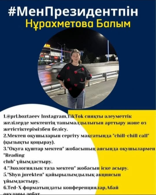 9 - сынып оқушысы Мектеп Президентіне үміткер Нұрахметова Балым Болатбекқызы