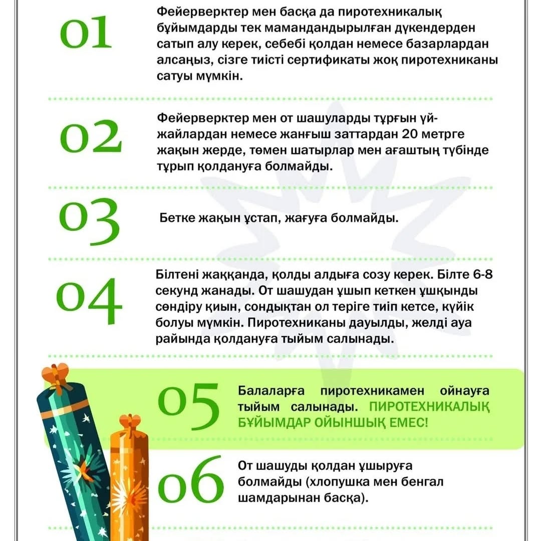 -отшашулар мен салюттерді балалардың қолы жетпейтін жерде сақтаңыз, пиротехниканы қалтаңызда алып жүрмеңіз;